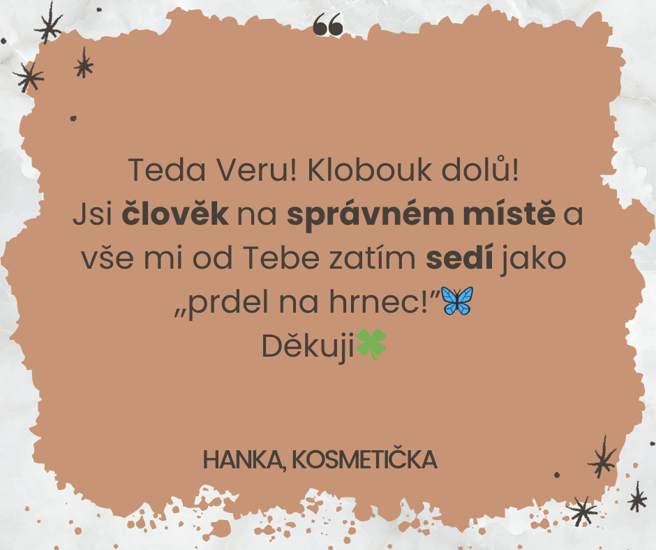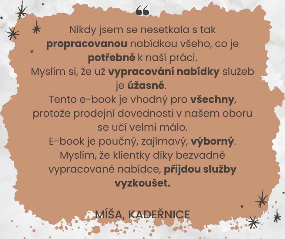 MOJE ODPOVĚĎ: „Je skvělé, že svou nabídku vnímáte pozitivně! E-book není o tom, že byste musela všechno měnit. Ukazuje, jak svou nabídku doladit tak, aby ještě lépe komunikovala vaši profesionalitu, přilákala klientky, které skutečně ocení vaši práci, a abyste si mohla říct o vyšší ceny bez pocitu viny."