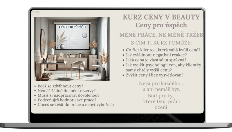 V této části Akademie Dolce Diva najdete všechno, co potřebujete, abyste rozuměla svým cenám, věděla, kdy a jak je zvyšovat.